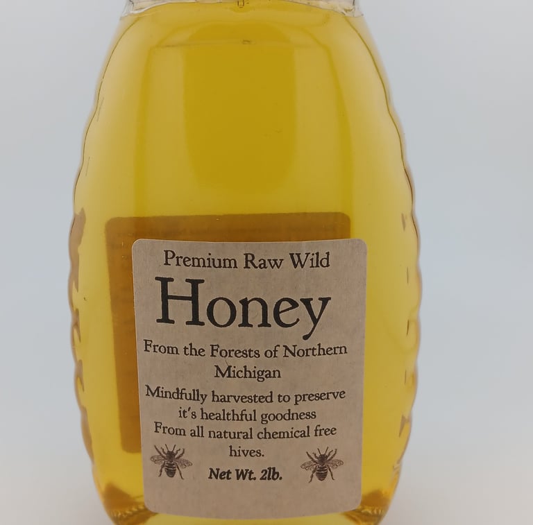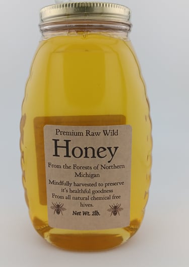 Raw, unfiltered honey from chemical free hives. Our apiary locations are far from agricultural fields. Bees collect nectar from wild trees and fields in our large northern forest lands.